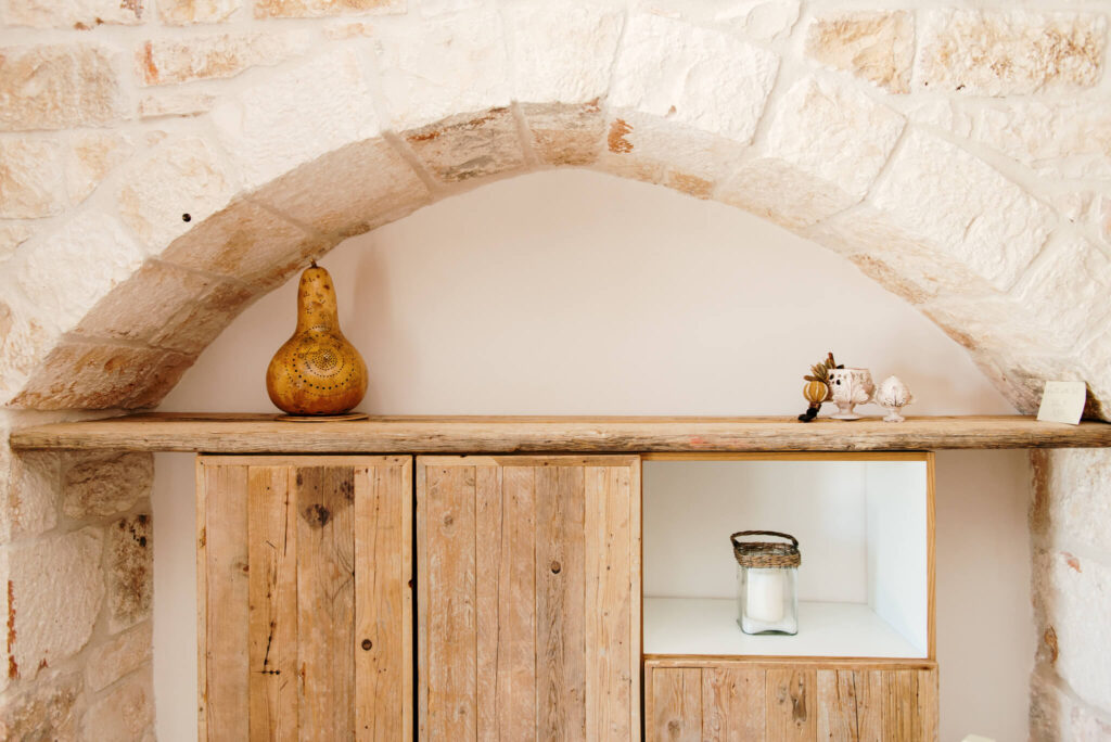 Nel 1700 una famiglia contadina ha costruito pietra su pietra, scavando la terra sotto i loro piedi, un umile riparo fatto di trulli per il riposo, una cucina spartana e un granaio per i raccolti della terra e gli animali. L’abbandono, a causa dell’urbanizzazione della popolazione rurale, aveva fatto piombare nel degrado la dimora; con un lavoro decennale l’abbiamo riportata in vita cercando di rispettarne la storia e lo stile, anche negli arredi.